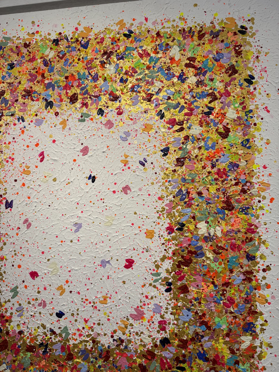 Acrylverf en reliëfpaint, emaille vlinders op koper, canvas en zwart bakkader